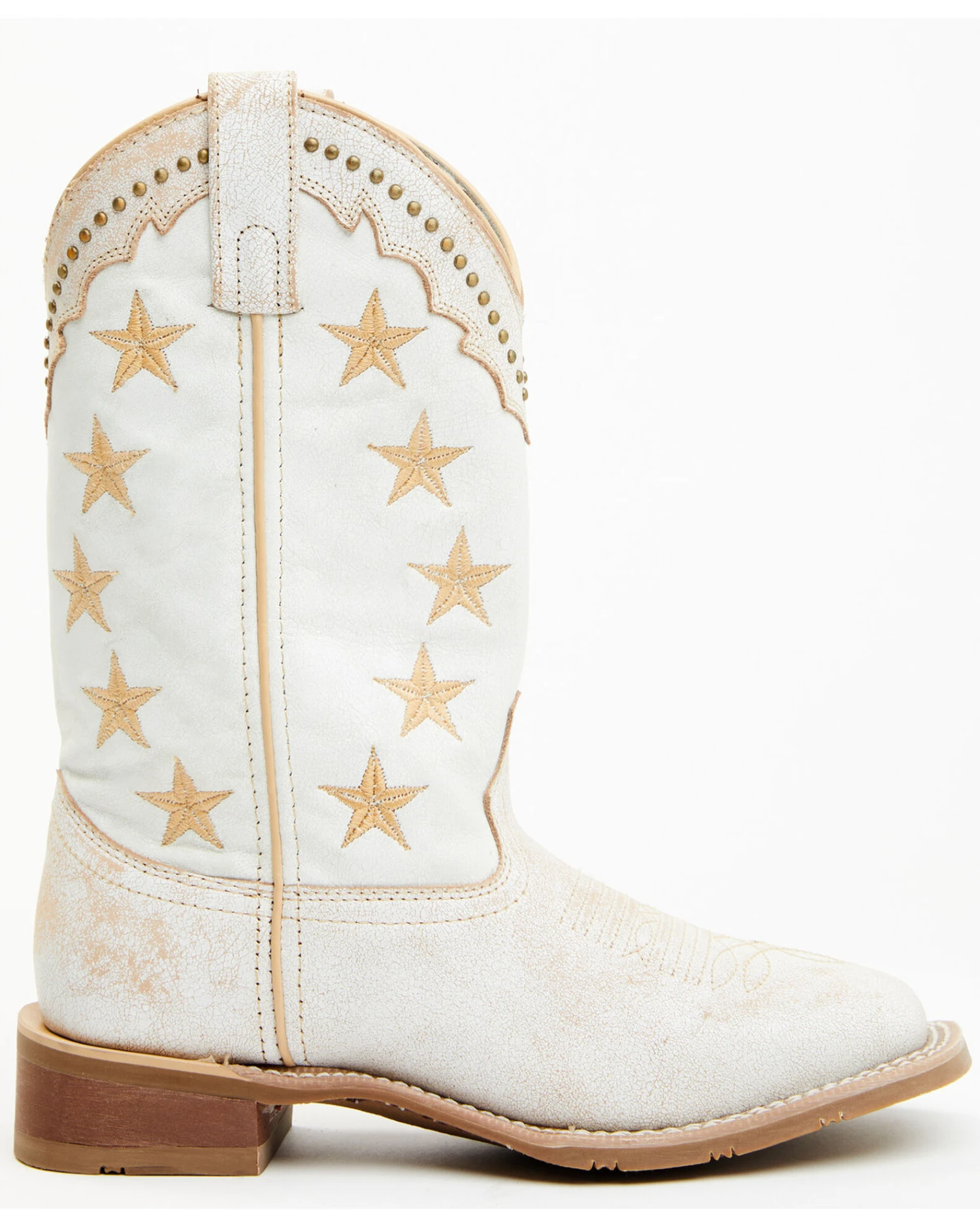 - Distressed white with tan star embroidery on shaft